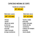 Capacidad máxima de corte Materiales suaves 3/8″ (9.5 mm) | Materiales duros 1/4″ (6.5 mm)
